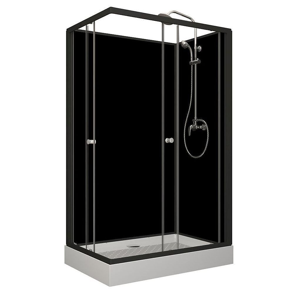 De douchecabine Black Happy bevat naast douchebak, deur en wanden ook gestandaardiseerd kraanwerk – een grote regensproeier in inox en een handsproeier met 3 functies. De aluminium profielen zijn matzwart gelakt en de achterwanden, 4 mm dik, zijn van zwart gekleurd glas, voor een extra designaccent. De schuifdeuren – in transparant veiligheidsglas, 5 mm dik – kregen dubbele wieltjes zodat ze nog vlotter glijden. De cabine is makkelijk te installeren (zonder siliconen) en onderhoudsvriendelijk.